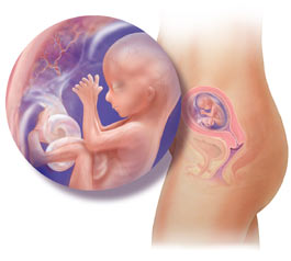 Your baby is now about the size of an avocado (about 5 inches / 11.6 centimetres long from crown to rump and weighing approximately 4 ounces / 100 grams). In the next three weeks he’ll go through a tremendous growth spurt, doubling his weight and adding inches to his length.In or out of the womb, babies are playful creatures. Yours may already have discovered his first toy — the umbilical cord — which he’ll enjoy pulling and grabbing. Sometimes he may even clutch it so tight that less oxygen gets through, but don’t worry — he doesn’t hold onto it long enough to harm himself. The circulatory system and urinary tract are in full working order, and he’s inhaling and exhaling amniotic fluid through his lungs.