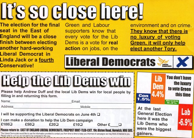 At least the Lib Dems are savvy enough to realise who their biggest threat is – a vote for the Greens is a vote that very likely would have gone to the Lib Dems. The big minor parties are close on many issues to one of the main parties – Lib Dems/Greens, Tories/UKIP and Labour/BNP. They are also less EU loving than their counterparts.