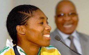Having said that, Caster has now become media hot property in South Africa and everyone in the news wants a piece of her. Some of the most controversial politicians in South Africa (Julius Malema and Winnie Madikizela-Mandela) made sure they were in the cameras to welcome her back and took the opportunity to get some nice soundbites in. ‘You’ magazine (a bit like ‘OK’ in the UK or ‘People’ in the USA put Caster in flowery dresses, gave her a makeover and presented her to its readers as ‘feminine’ under the heading ‘Wow, Look at Caster now!’. Her coach resigned this week stating that she had been duped into taking sex tests and that he was ashamed about the role he had played in it all.