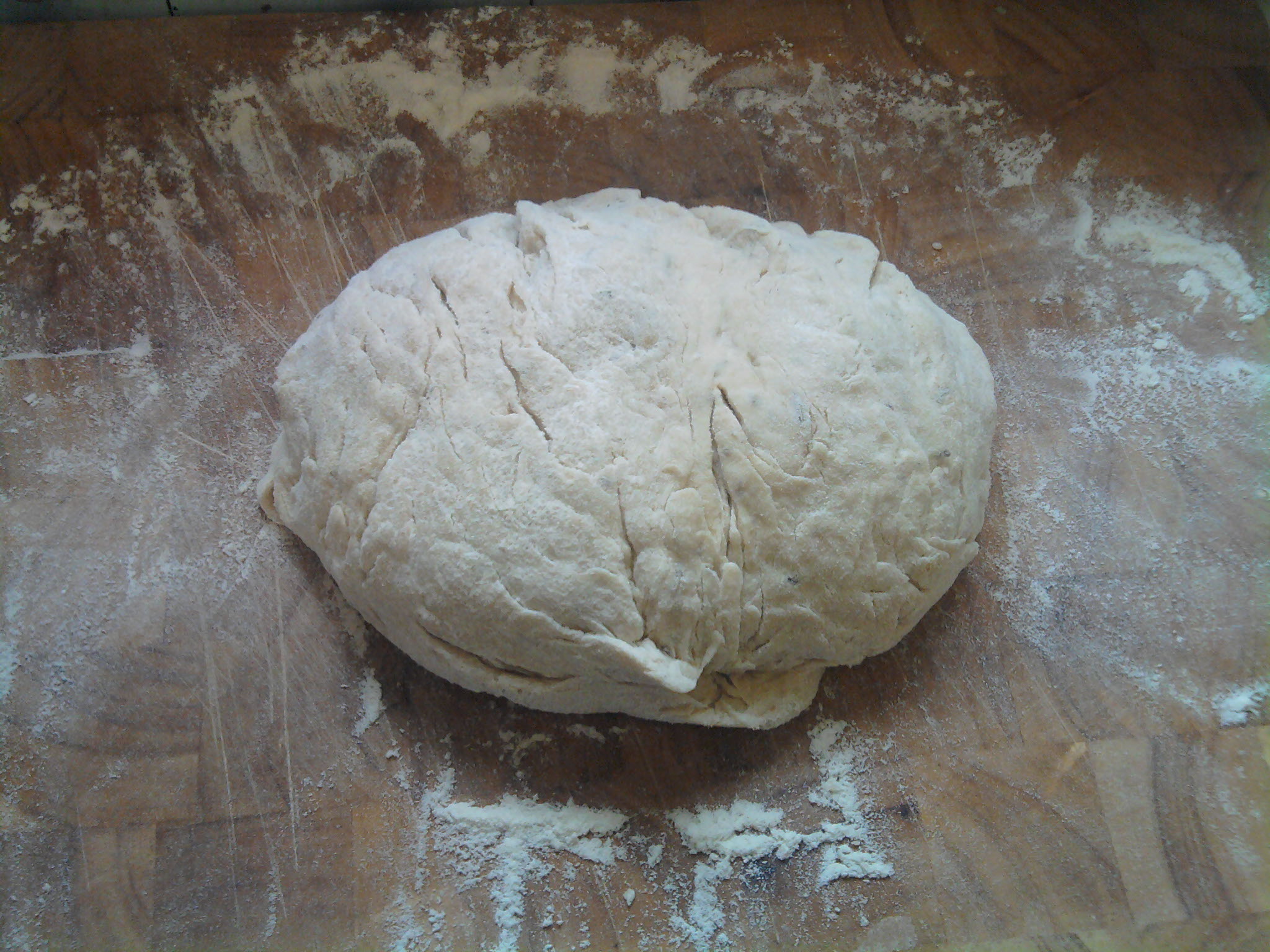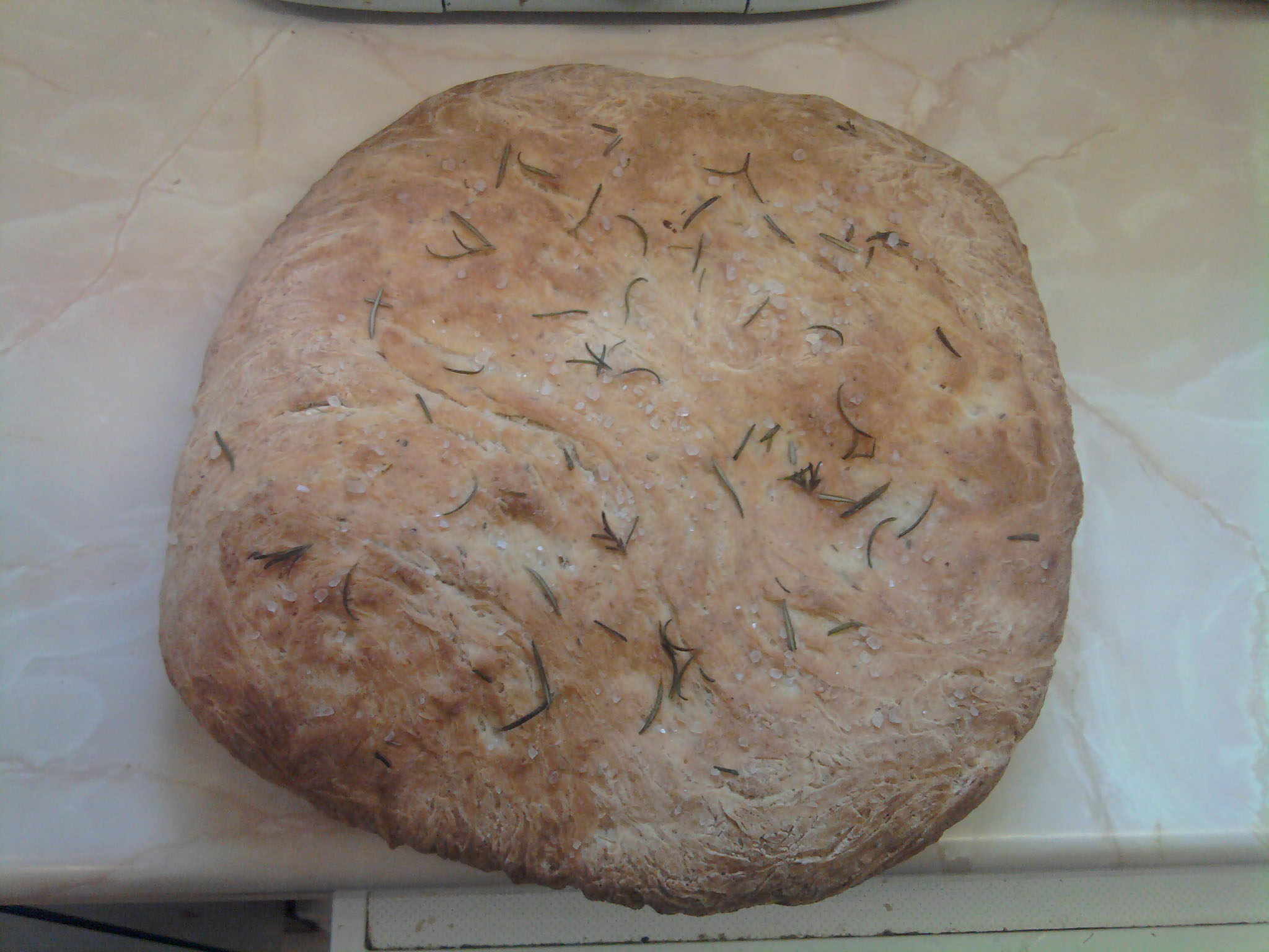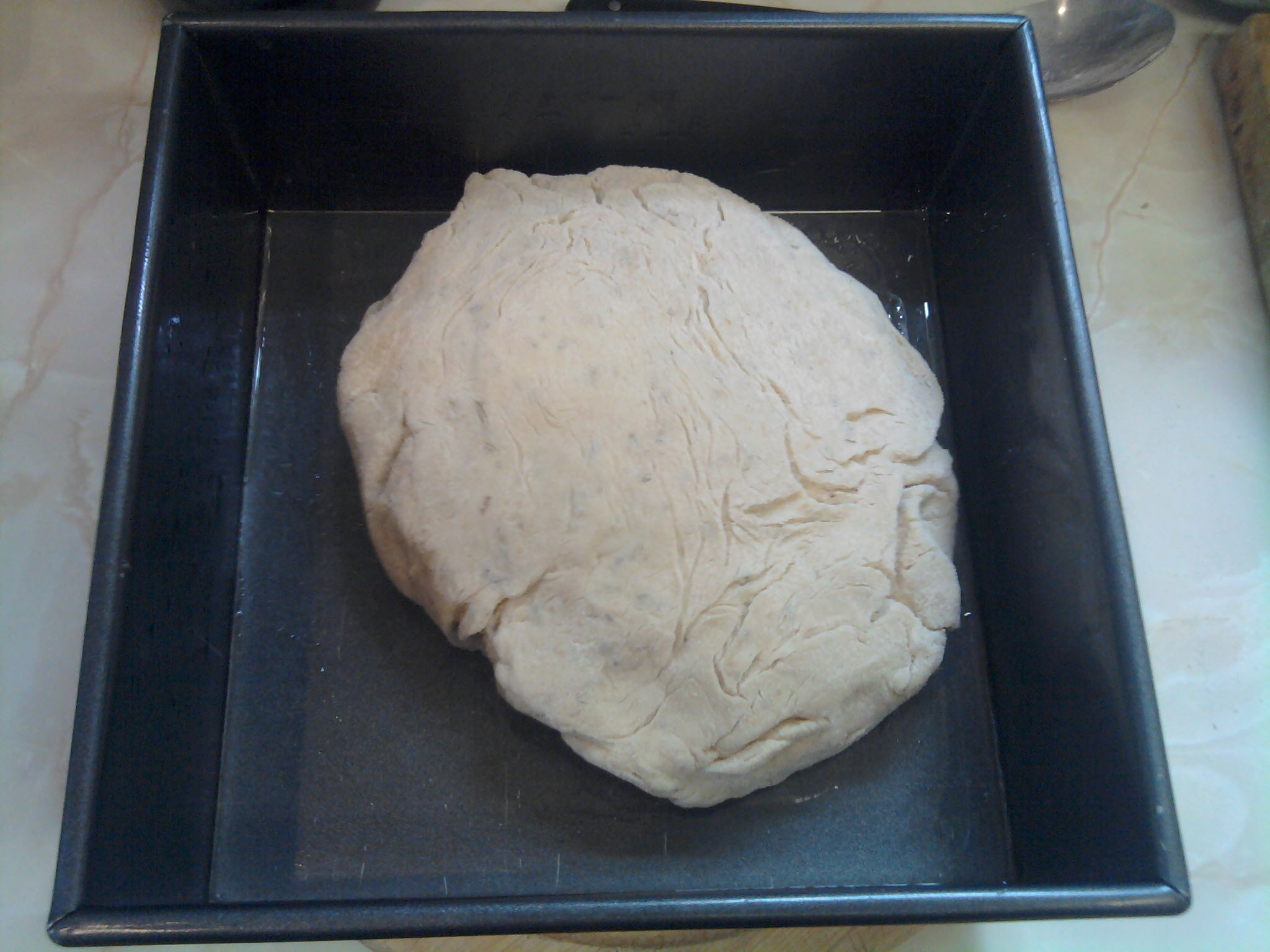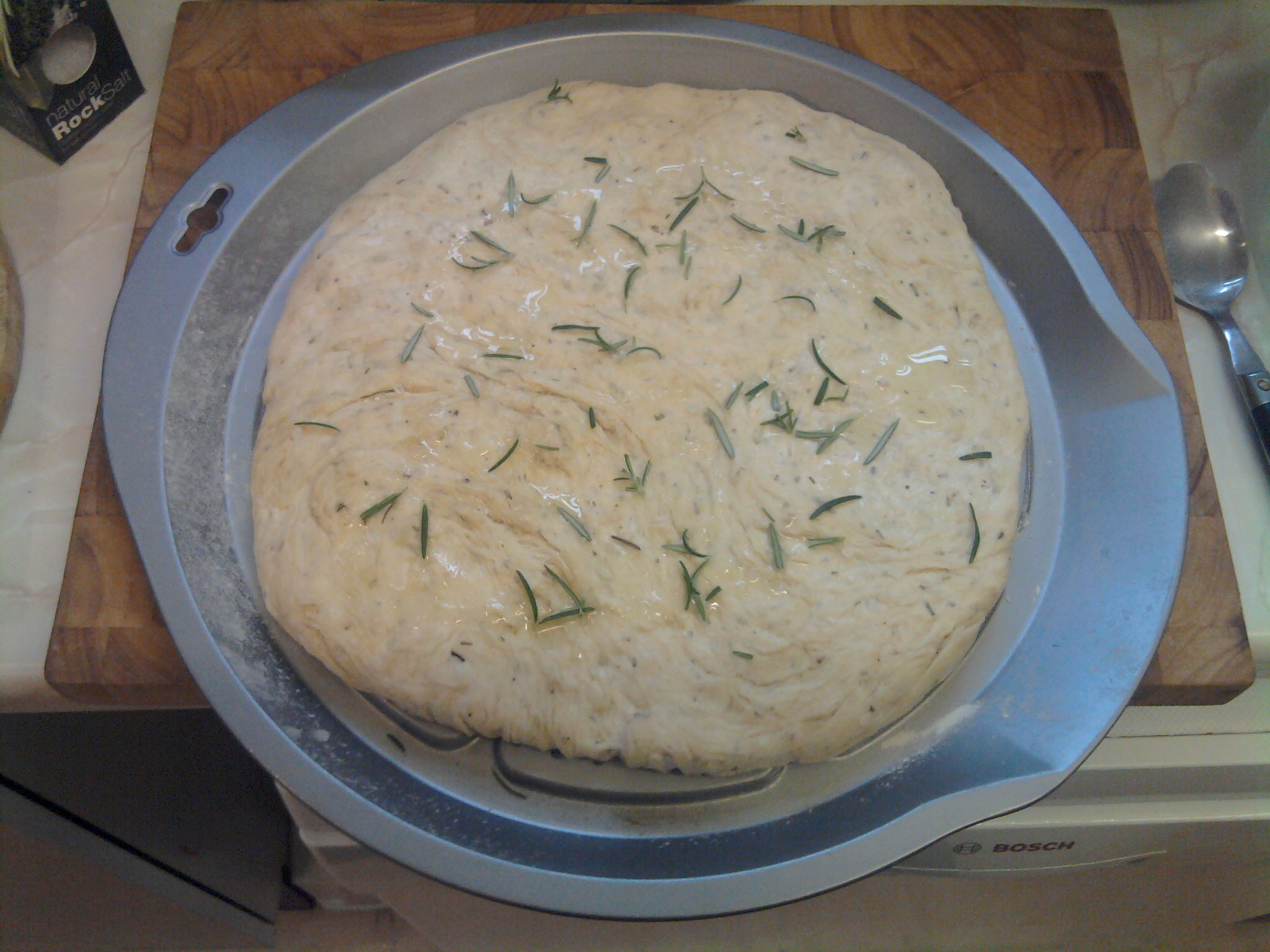 4 – Transfer to pizza tray, spread gently, sprinkle with rock salt, rosemary from the garden and olive oil and then place in oven