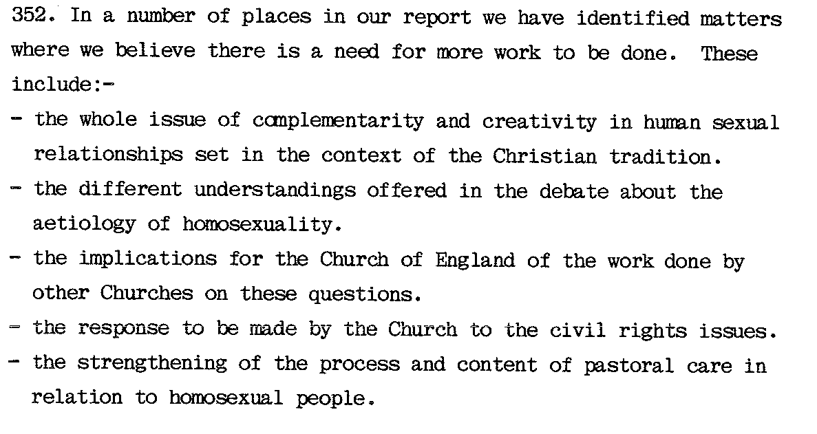 It’s fascinating reading. The outcome was basically a call for the Church of England to work towards some kind of deeper theology around the area of human sexuality, sexual identity and relationships. The specific recommendations were: