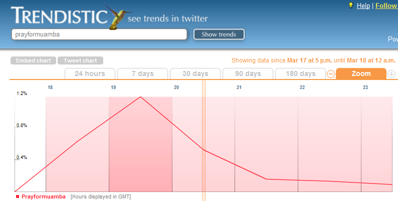Was that “something” just the peak physical state that Muamba was in, or was it more? Within minutes of Muamba collapsing the #prayformuamba meme launched itself on Twitter, quickly rising to feature in over 1% of all tweets that evening as this chart show (click on the chart to enlarge).