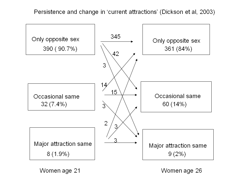 J&Y though is not the only piece of research on the subject. Whilst J&Y have examined fluidity amongst those who purposefully seek to move towards greater heterosexual functioning, other researchers have explored general sexual identity and attraction movement amongst a general population. One of the most famous of these studies is the 2003 piece by Dickson, Paul and Herbison (DP&H) where as part of a cohort study of women born 1972/1973 they explored variant sexual behaviour over time.