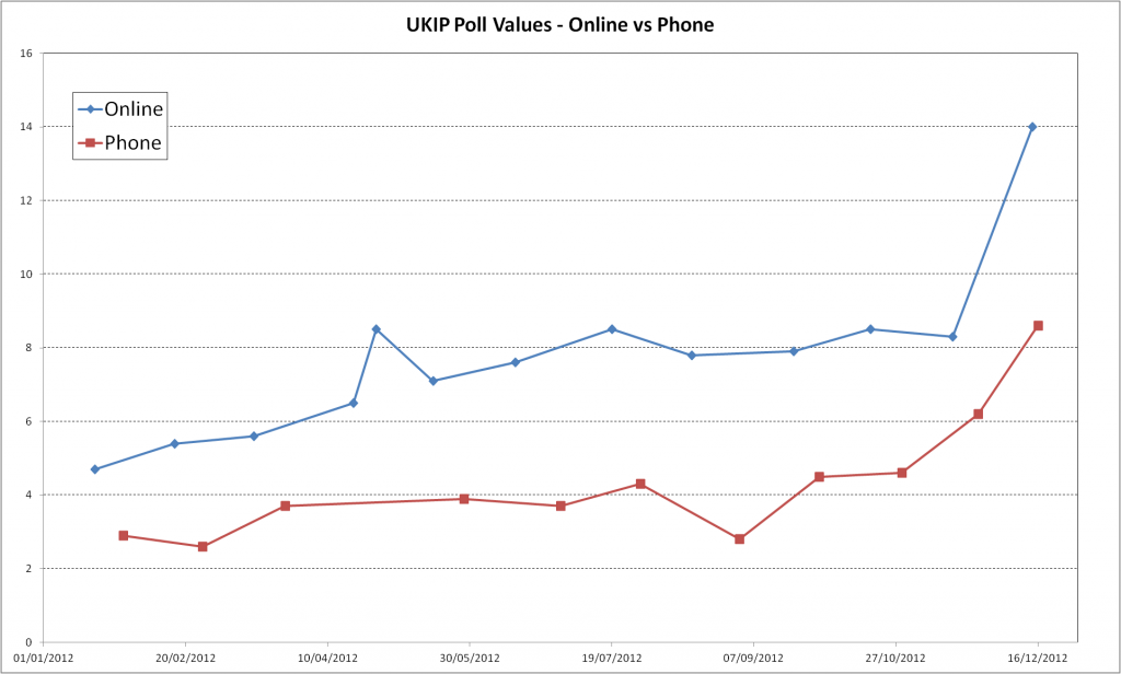 There are clear differences between the UKIP votes recorded in online and phone polls. The chart below shows the variance in support registered for UKIP depending on what kind of poll was conducted.