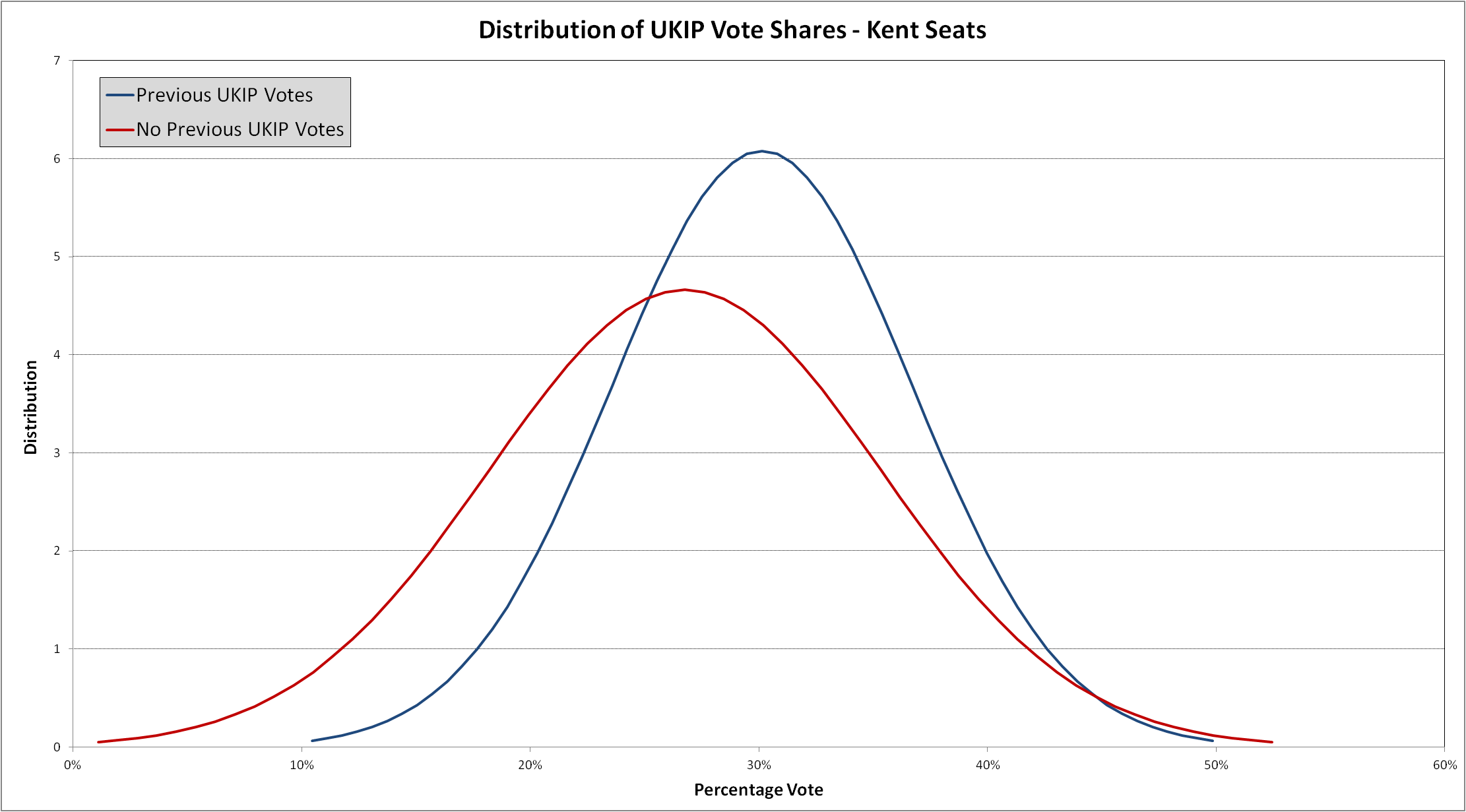 To explore the UKIP performance I looked at the individual ward results here in my home county of Kent. I split the overall data up into two sub-population – firstly seats where UKIP fought in 2009 and fought in 2013 and secondly seats where UKIP didn’t fight in 2009 but fought in 2013. The difference are staggering.