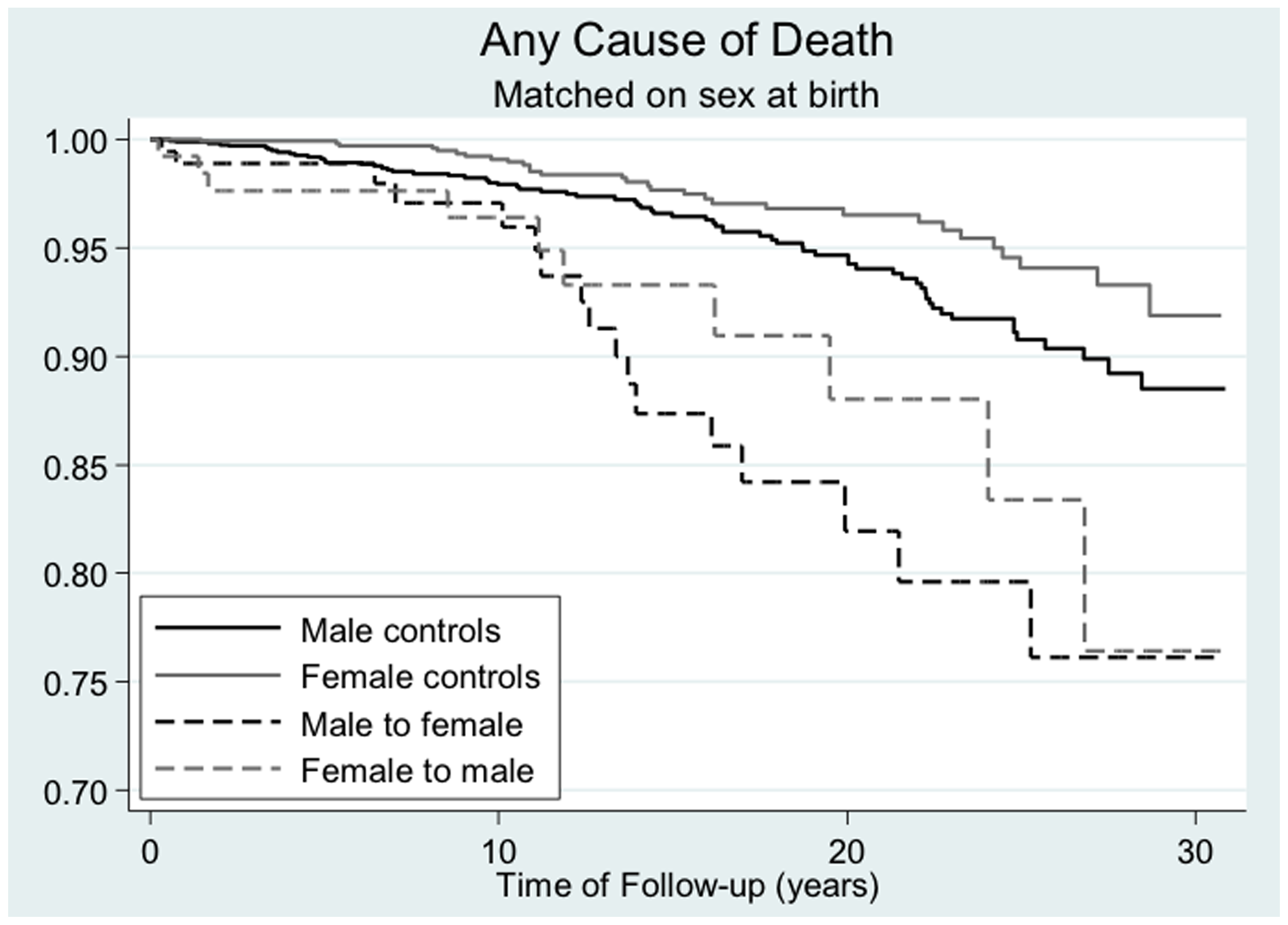 This is a mortality curve showing the percentage of the original population still living at x years after original operation. You can see the general observation that more men die earlier than women, and this pattern is repeated for those who were pre-op males (so post-op female). But the staggering thing of course is how after ten years or so the mortality rates rapidly increase for those who have undertaken transition surgery.