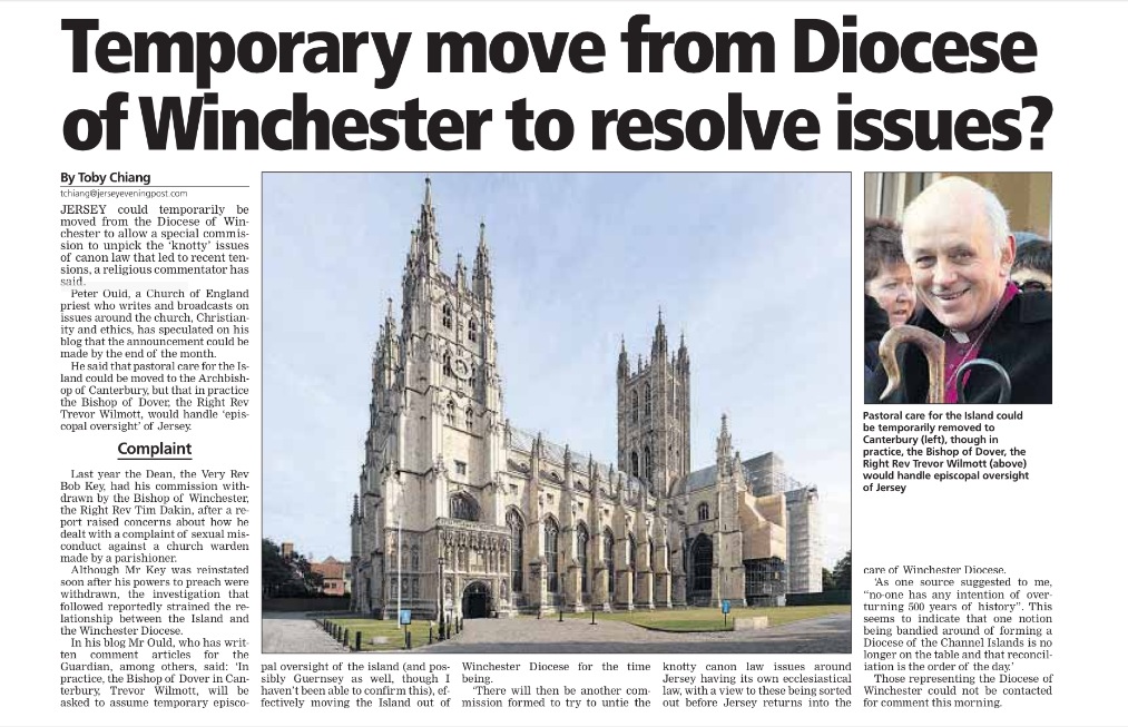 Jersey Evening Post this morning Peter Ould Posted on January 22, 2014 Posted in Church of England, Jersey, Winchester Diocese 1 Comment A report from ITV in the Channel Islands is here. Related